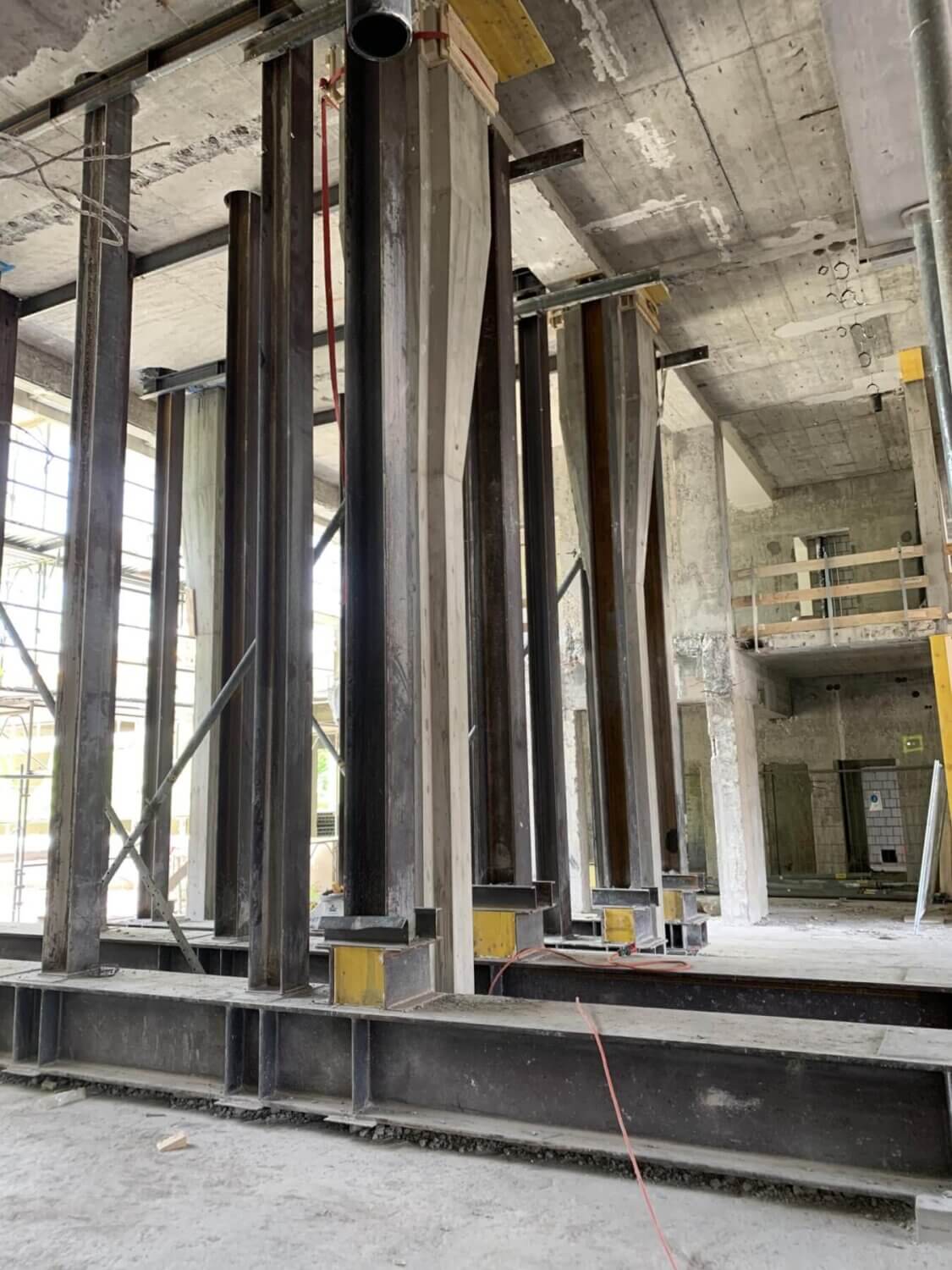 Das Spital wurde bis auf den Rohbau zurückgebaut. Die komplette Südfassade sowie das filigrane Gitterwerk aus Betonelementen auf der Nordseite wurden erhalten. Aus Gründen der Erdbebenertüchtigung wurden die beiden äusseren Erschliessungskerne durch neue Treppenhäuser und Liftschächte näher an der Zentralachse des Gebäudes ersetzt. Durch diese Verschiebung dienen sie der vertikalen Versteifung, und es wird eine höhere Flexibilität bei der Ausgestaltung der Wohnungstypologien erreicht. Zur Längsaussteifung wurden drei gebäudehohe Mauerscheiben einbetoniert.