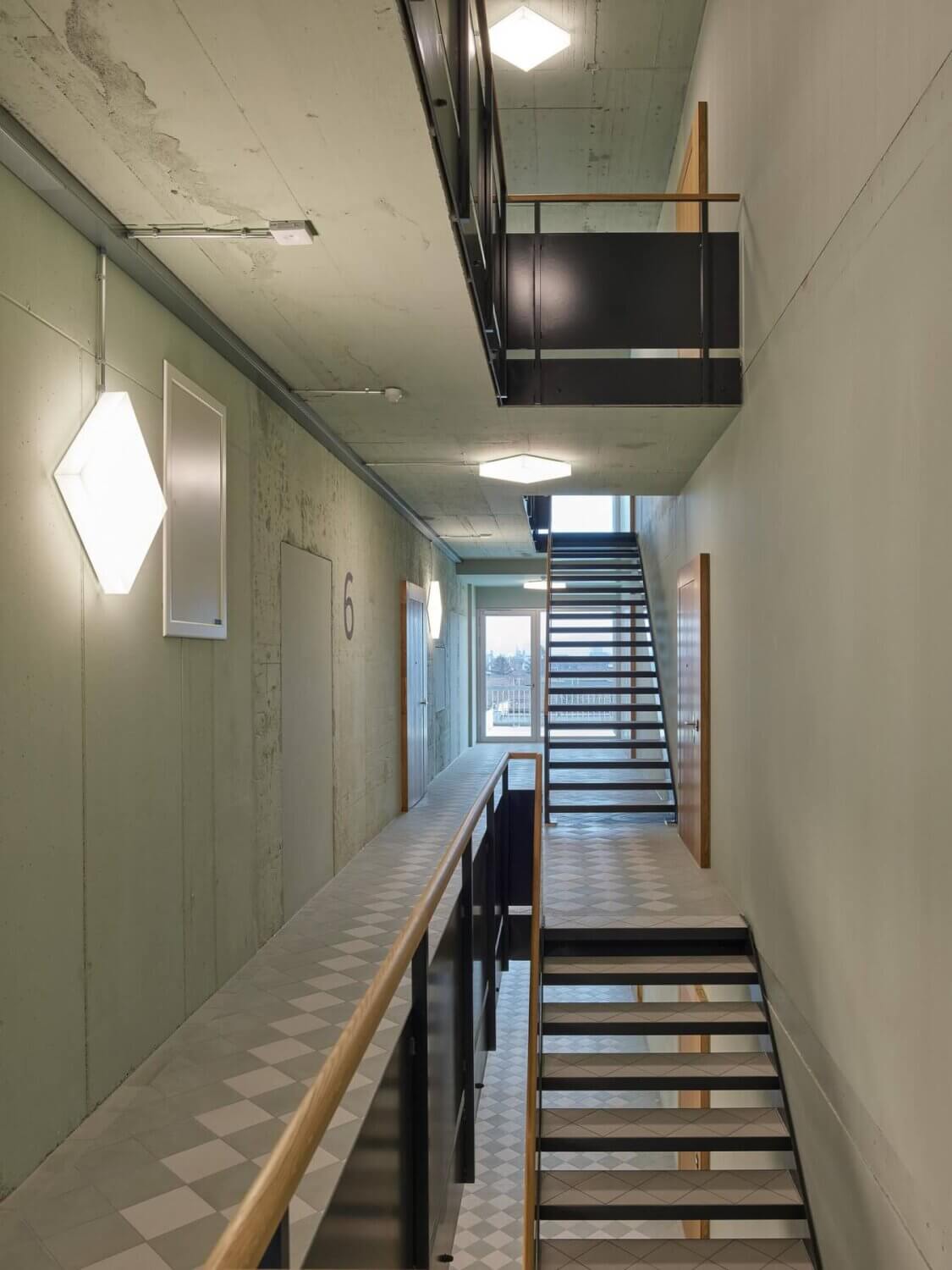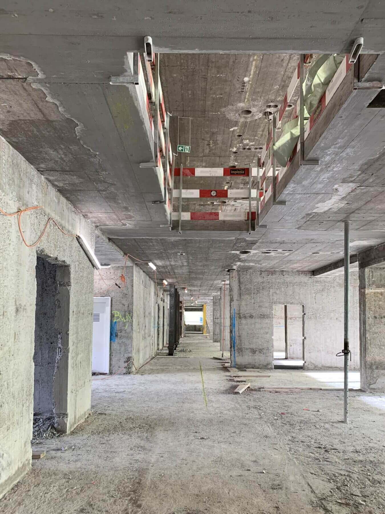 Da es sich um eine Umnutzung handelte, genoss das Gebäude keinen Bestandsschutz mehr, d.h. der Bau musste grundsätzlich Neubaunormen erfüllen – alle neuen Anforderungen in die alte Hülle! Grosse Herausforderungen gab es da bei teilweise entgegenwirkenden Anforderungen, beispielsweise zwischen bestehender, minimal ausgelegter Statik (die möglichst keine zusätzliche Masse im Gebäude ertragen würde) und den Schallschutznormen (deren Werte gemeinhin das Einbringen ebendieser zusätzlichen Masse erfordern). In diesem Fall wurde die Lösung mit einem kompakten Trockenestrich erreicht, in dem die Heizschlaufen eingelegt wurden.