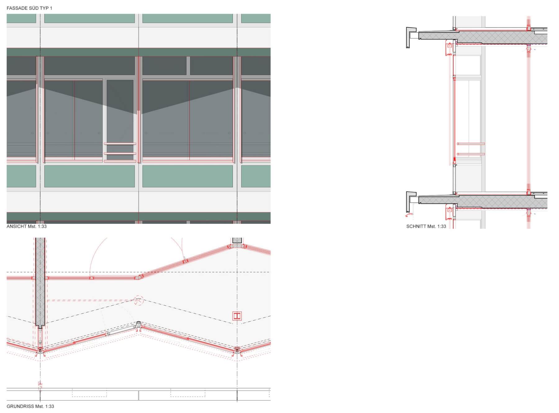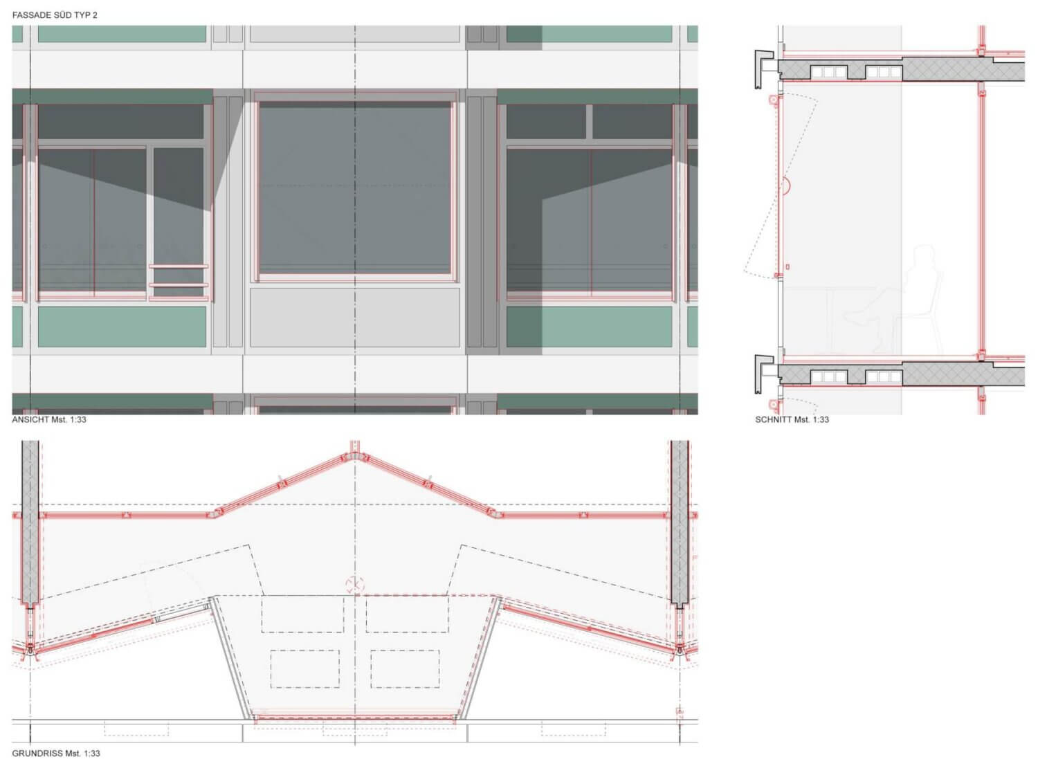 Um die detailreiche Südwestfassade energetisch zu sanieren, wurde eine neue, vollverglaste Fassadenschicht hinter der historischen Aussenhaut eingezogen. Dadurch bleibt die Fassade mit ihren drehbaren Fensterflügeln erhalten, und die dazwischenliegenden Räume sind als Wintergärten ganzjährig nutzbar.